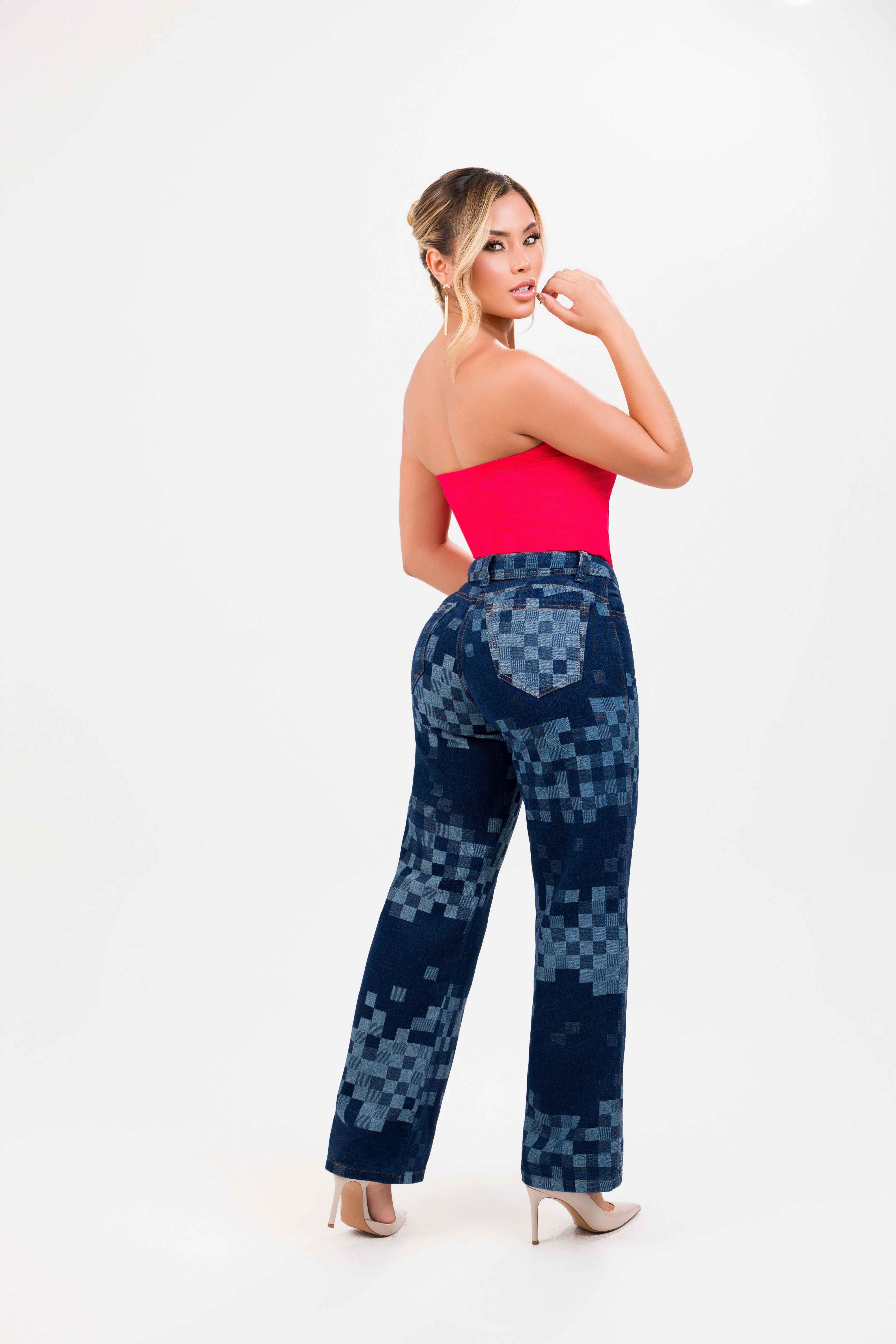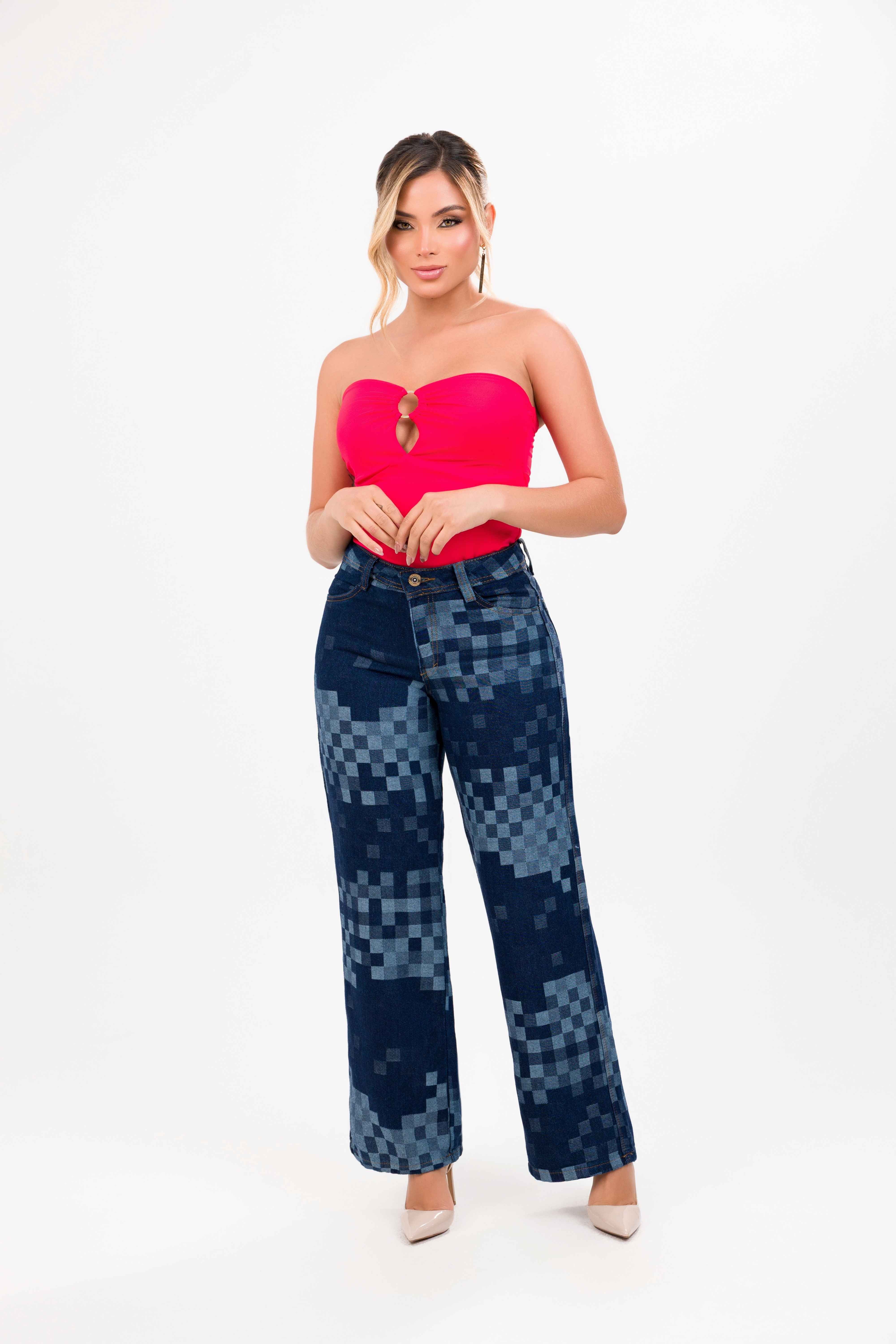 REF: 1876 Jean palazzo, rígido, un botón, tiro medio, con diseño en cuadros no uniformes
