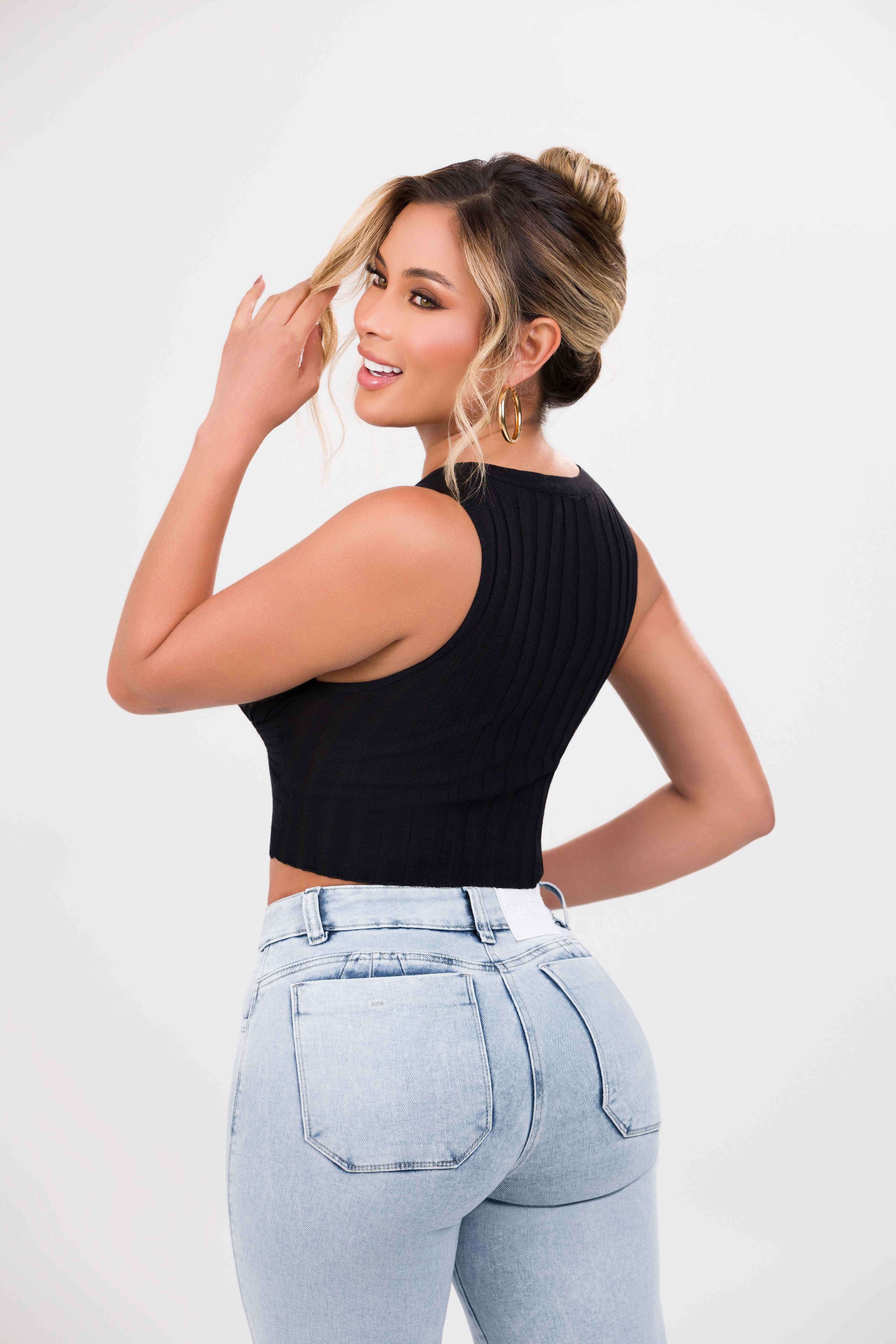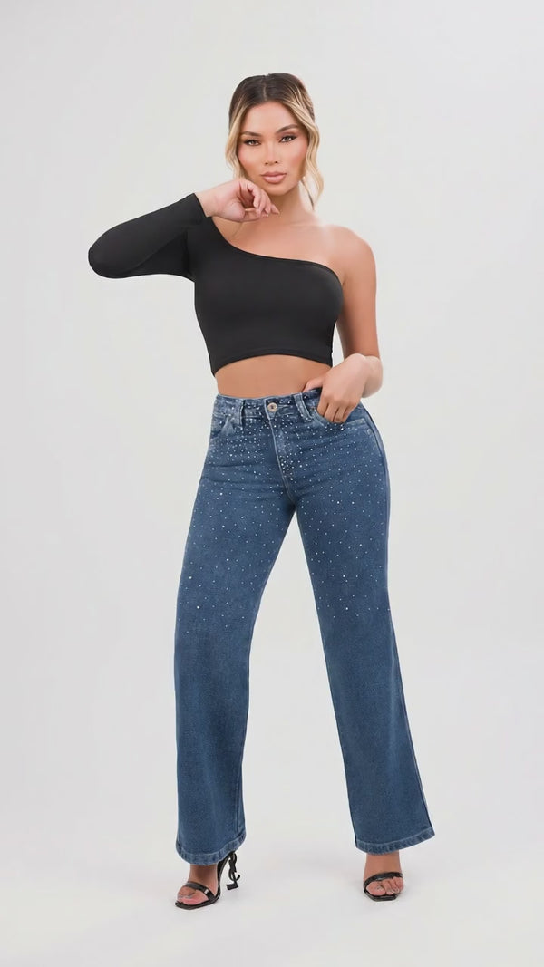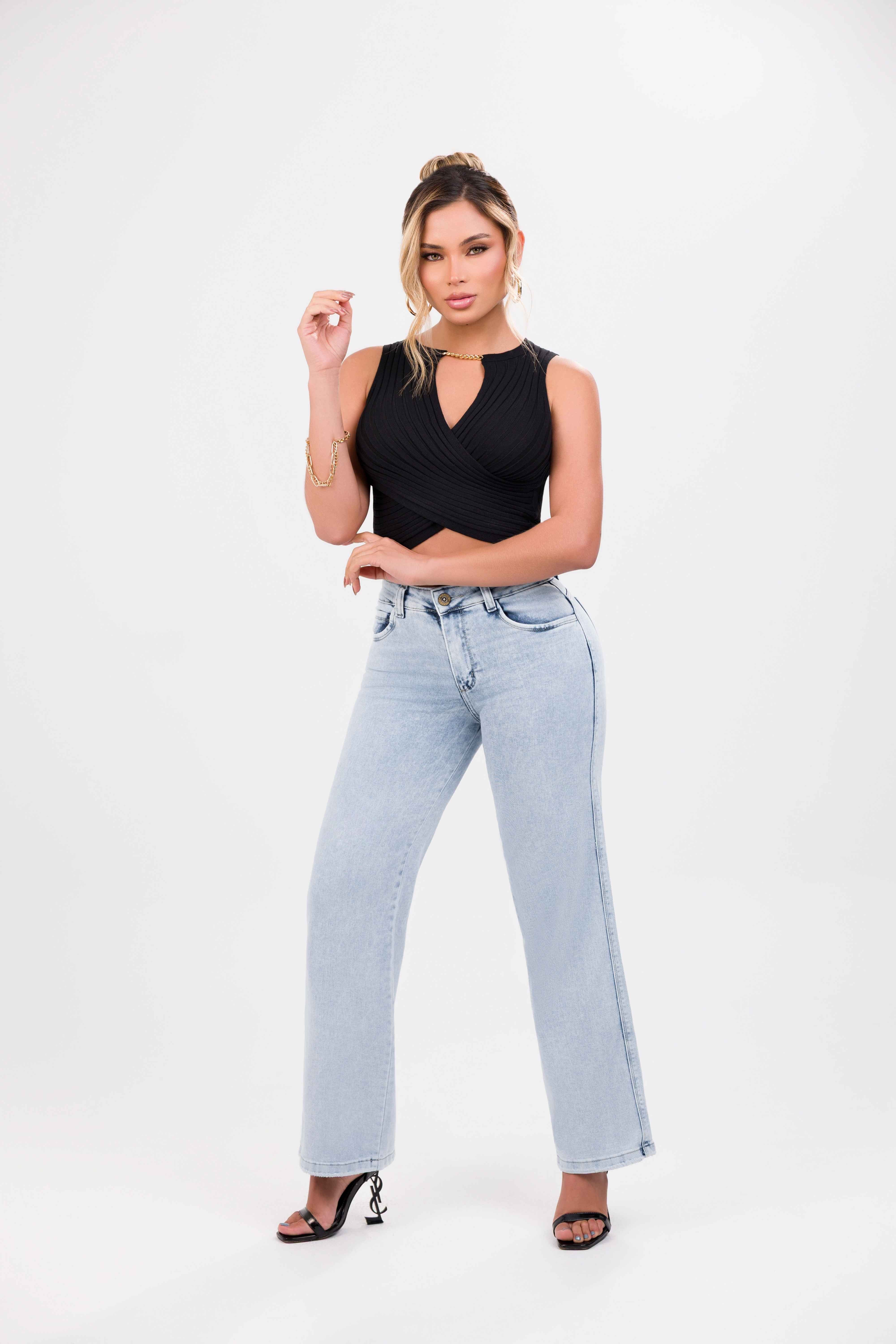 REF:1805 Jean palazzo, licrado, un botón, tiro medio, tono hielo
